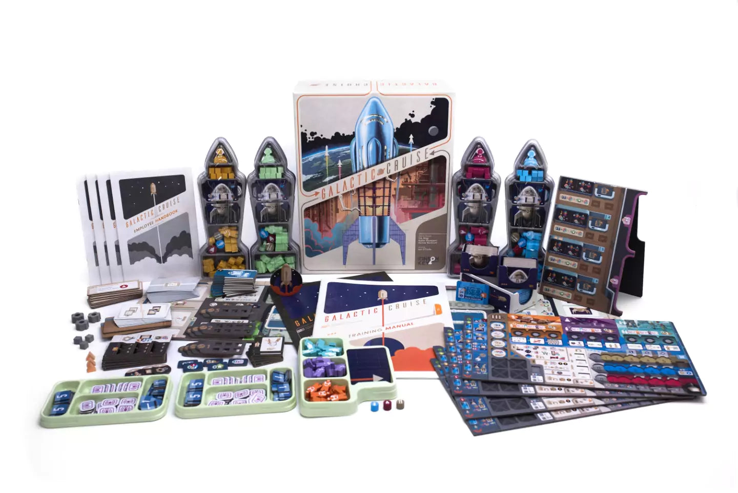 Galactic Cruise is a worker placement game that involves tableau building, multi-use cards, and resource management where players take on the role of high level supervisors of Galactic Cruise, the first company to offer extended-stay space vacations. The current CEO of the company is retiring, and one of the supervisors will take his place. In order to clinch the position, you'll need to not only build shuttles and satisfy the guests as you schedule and pilot cruises on luxurious space vacations, but also to help the company thrive by enhancing the company network, inventing new technologies, and growing the workforce.
